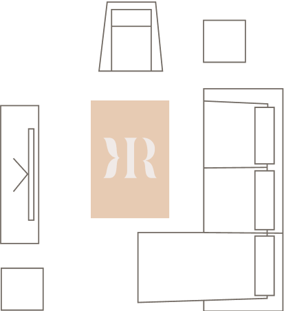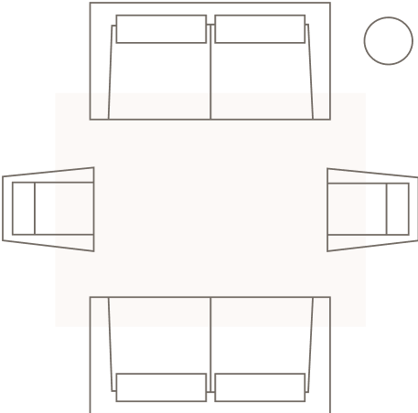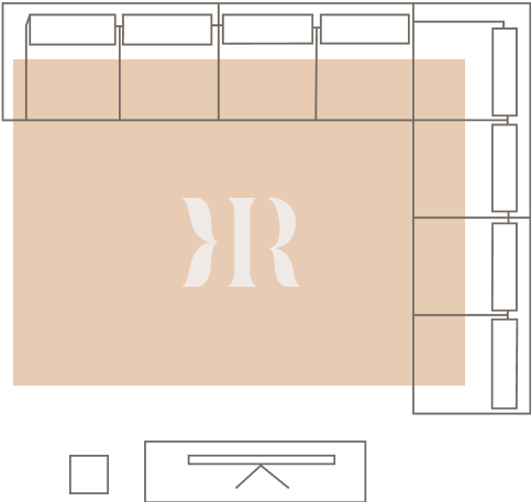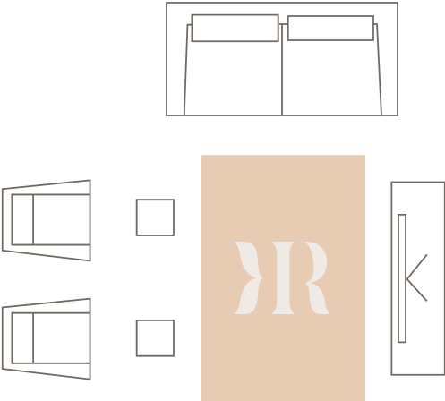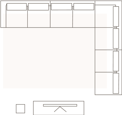 Up to 5' x 8' Both your furniture and your flooring are showcased in this arrangement with sofa legs off the rug. This provides a comfortable distance for conversation while using a smaller sized rug.